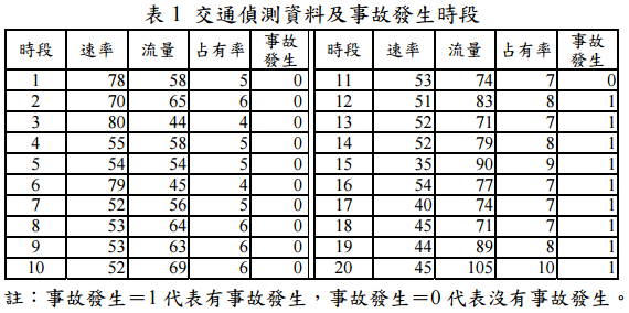資料說明:某一路段每 5 分鐘偵測器所偵測之交通資料如表 1 所示。其中,時段 12 剛好發生一件交通事故,但直到時段 20 均未能清除完畢。