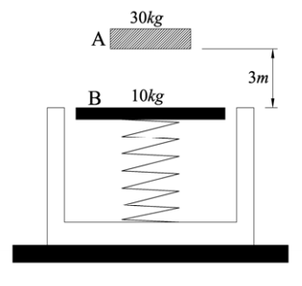【已刪除】三、有一 30 kg 的質塊,從 3 m 高落下,並掉落在質量為 10 kg 的秤盤上,假設此撞擊係 完全塑性,彈簧的彈性常數為 10 kN/m,試求此秤盤的最大位移量為何?(20 分)