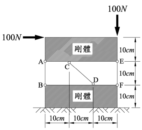 【已刪除】一、有兩個剛體利用三支二力桿 AB、CD 以及 EF 來連接,其所受外力如圖所示,試求 此三支二力桿所受之力。(20 分)