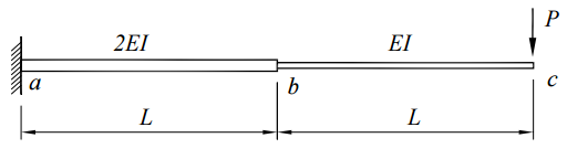 【已刪除】一、下圖所示為一懸臂梁。該梁係由兩節不同斷面之構材所組成,且每一節的長度均為 L。若撓曲剛度 EI 為常數,現於其自由端處施加一個向下的力量 P,試求 c 點之撓 度。(25 分)