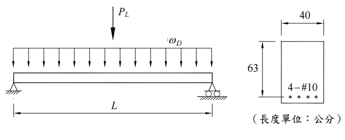 。 現於梁斷面內配置4-#10 拉力鋼筋(每一根#10 鋼筋之截面積為 8.1 cm