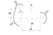 【已刪除】三、請依視圖所示之尺度以比例 1:1 繪製下圖並標註尺度;A 為半徑 R50 內切於 R10 與 R15 兩圓弧,B 為半徑 R80 外切於 R20 與 R15 兩圓弧。(30 分)