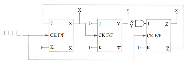 【已刪除】四、下列數位電路圖中使用三個 JK 正反器(Flip Flop)及一個 AND 邏輯閘構成。當輸 入一系列的時脈信號(clock signal)時,請分別繪出其三個輸出端(X、Y、Z)的 信號;並請問此電路是一個什麼電路?(20 分)