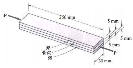 【已刪除】三、有一複合桿件係由鋁片夾合黃銅片所組合而成如圖所示,該桿件受到一荷載P=40 kN; 若鋁片之楊氏模數E