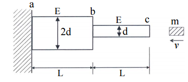 【已刪除】二、圖示軸向受力圓桿,若受一質量 m=20 kg 鐵塊,以速度 v=35 m/sec 撞擊自由端, 試求其自由端最大變位量,已知:E=200 GPa、d=0.1 m、L=2 m。(20 分)