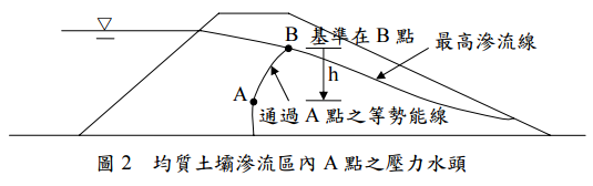 【已刪除】二、試證明均質土壩滲流區內某點 A 之壓力水頭,等於該點 A 與通過該點之等勢能線 與最高滲流線交點 B 之垂直高度 h(位置水頭),如圖 2 所示。(10 分)