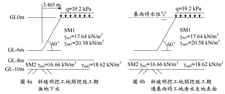 ⑵暴雨時工地淹水至地表面,如圖 4b所示,請分析總應力之主被動平衡之邊坡安全 係數F