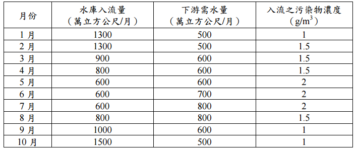 )、最大 庫容為 12000 萬立方公尺、生態基流量每月皆為 100 萬立方公尺/月。【註:水庫放 水之污染物濃度可以該月水庫水體之平均污染物濃度估計】(20 分)
