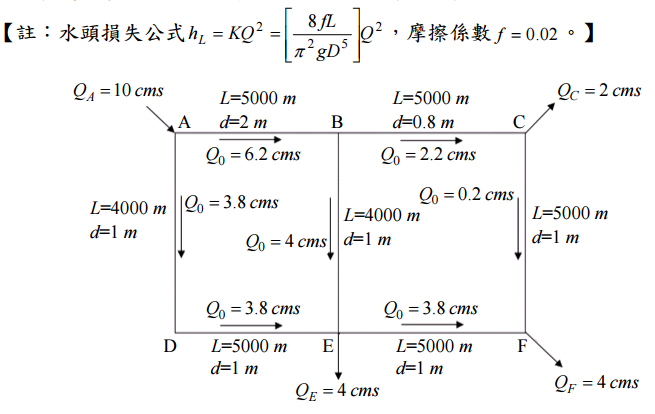 【已刪除】五、下圖為一自來水管網示意圖,圖中 L 為各管線長度,d 為各管線管徑,