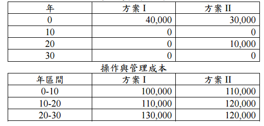 【已刪除】三、下列表格為某地區往後 30 年兩種可能供水方案,分別為建造成本及操作與管理成本。 請選出最低成本之供水方案,假設利率 0~10 年為 6%,10~30 年為 5%。(20 分) 建造成本(×10
