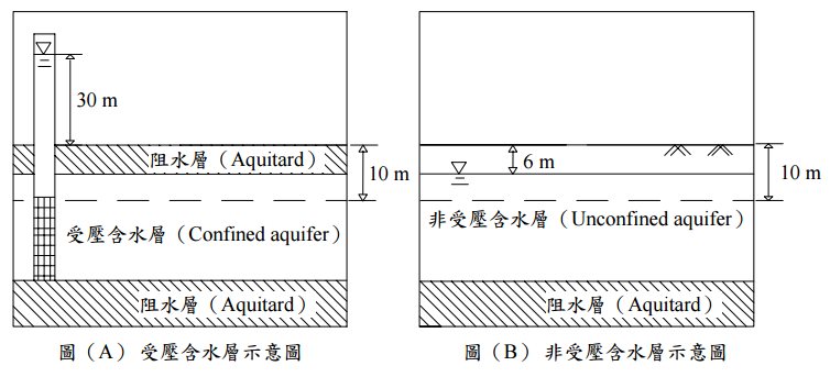 【已刪除】四、地下水超抽常易導致地層下陷,惟抽水對含水層的影響,會因含水層結構的不同而 有很大的差異。下圖為不同含水層示意圖,圖(A)為受壓含水層(Confined aquifer)及其未抽水時之地下水位面,圖(B)為非受壓含水層(Unconfined aquifer) 及其未抽水時之總水頭高。若兩含水層單位面積抽水量皆為 0.2 m 時,試分別計算 如下圖所示各含水層於地表下 10 m 處,抽水前後有效應力之變化量。圖(A)受壓 含水層之貯水係數(Storage coefficient, S)為 0.01,圖(B)非受壓含水層之比流率 (Specific yield, Sy)為 0.1,且兩含水層之孔隙率皆為 0.15。(20 分)