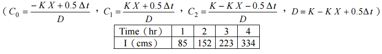【已刪除】二、已知某河川之入流量歷線如下表所示,假設其初始出流量為 85 cms,X=0.2,K=2 hr, 試以馬斯金更法(Muskingum Method)計算出各時刻的出流量。(20 分)