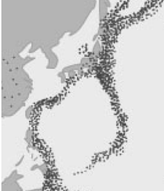 【已刪除】六、請用下列地震發生地點分布圖,說明西太平洋地震帶與海洋板塊活動之關係。(15 分)