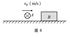 【已刪除】四、質量為mA(kg)的球A以水平速度v0(m/s)撞擊到質量為mB(kg)的靜止物體B,如 B 圖 4 所示,假設A與B間的撞擊恢復係數(Coefficient of restitution)為e,且物體B與 水平面的動摩擦係數為μk,試求撞擊後物體B在停止前滑動的距離為若干?(25 分 )