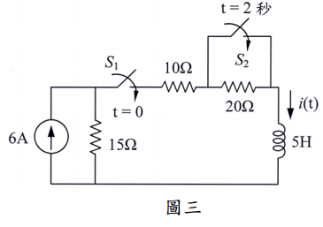 在t = 2 秒時關上(close),求t > 0 後電感的電流i(t)。(20 分)
