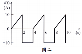【已刪除】二、圖二所示為流過 2Ω 電阻的週期性電流特性,求該電阻消耗的平均功率(average power)。(10 分)
