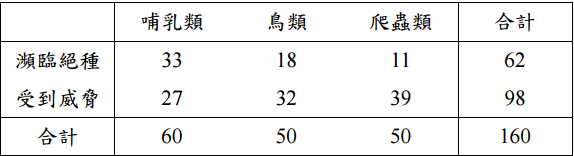 【已刪除】四、一項研究調查報告如下表所示。請用 α=0.01 顯著水準來檢定脊椎動物的種類和牠 是否“瀕臨絕種”或是“受到威脅”的物種之間是否有關連?(20 分)