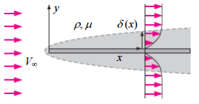 【已刪除】五、考慮二維邊界層(boundary layer)沿著一薄的平板成長,如圖所示。邊界層厚度 (boundary layer thickness)δ僅是座標x的函數,自由流場速度(free stream velocity) 為V