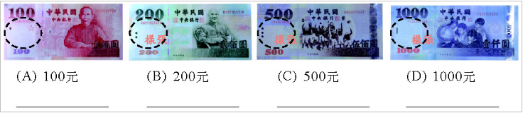 1.請依各鈔票之迎光透視水印說明100.200.500及1000元之圖案為何。