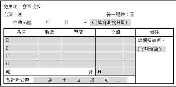 【已刪除】3. 麥小姐為B國際貿易有限公司(統一編號12341234)購買四種文具公司用,給予1000元鈔票1張付款,明細如右列:鋼筆2組每組300元/包裝紙、提袋各1組每組100元/顏料2組每組100元,請您開立免用統一發票收據,依下列方框內標示題號(A至J)依序作答,填寫於答案卷並註明題號。