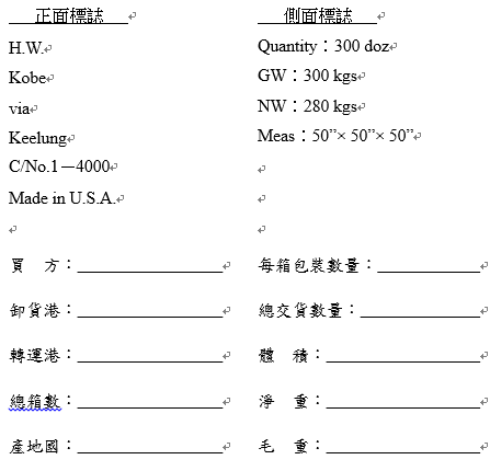 【已刪除】四、試將SHIPPING MARK裝運標誌之資料填入 (10格 每格2分 共20分)
