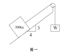 【已刪除】一、圖一所示,有一長方塊重 200 kg,長方塊與斜面間之摩擦係數為 0.3,欲使長方塊靜止 在斜面上,則物體 W 值之範圍為若干?假設滑輪與繩間之摩擦可以忽略。(25 分)
