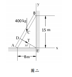 【已刪除】二、圖二所示,有一均質桿 AB,重 400 kg,支撐在水平及垂直光滑面上,另以一繩索 將桿子繫住。試求繩索受之張力 T 為若干?(25 分)
