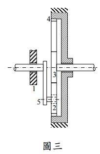 【已刪除】五、如圖三所示之行星齒輪系,環齒輪 4 被固定,以太陽齒輪 3 為輸入件,行星臂 5 為 輸出件,我們想要使太陽齒輪 3 與行星臂 5 的轉速比值為 5,且轉向相同。已知太 陽齒輪 3 的齒數為 30 齒,試求行星齒輪 2 與環齒輪 4 的齒數。(20 分)