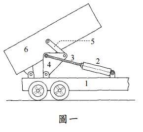 【已刪除】一、如圖一所示之平面機構,以車體 1 為固定桿,指出該機構的用途,並計算該機構的 機件數目、各種運動對的數目及其自由度。(20 分)