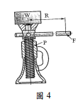 【已刪除】四、考慮一雙線螺旋起重機,如圖 4 所示,螺距(pitch) 為 P=5 mm,手柄長為 R=20 cm。若柄端之施力為 F=20 N,且在無摩擦損失下,則可升起質量 m 為 多 少 kg 之物體 W? (重力加速度 g= 9.8 m/s