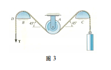 【已刪除】三、假設圖 3 繩索(cord)可承受之最大張力(tension)為 500 N。若位於 A 處之滑輪 (pulley)可以自由轉動,而位於 B 和 C 處固定半圓鼓(drum)的靜摩擦力係數均 為 μ