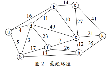 【已刪除】四、請參考圖 2。每一條線段上的數字代表兩節點間的距離。請找出 a 節點到 k 節點的 最短路徑的長度。並請說明你的方法如何應用在非常大型的圖裡。(15 分)