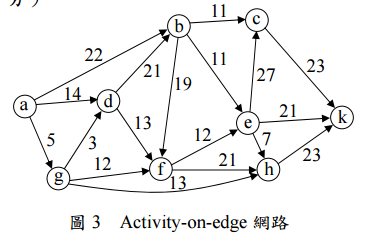 【已刪除】五、請參考圖 3。圖 3 是一個 activity-on-edge 網路。在 activity-on-edge 網路中,一項計 畫可以分成很多件工作,每一件工作由一條線段代表,線段上的數字代表該工作所 需的時間(以工作日為單位),線段的箭頭代表工作的先後關係。例如在圖 3 中, ab 及 db 線段代表的工作完成之後,bc、be、及 bf 線段代表的工作才可以開始進行, 其他的先後關係依此類推。a 節點是起點,k 節點是全部工作的完成點。請找出 k 節點的最早完成時間及關鍵路線(critical path)。並請說明你的方法如何應用在非 常大型的圖裡。(15 分)
