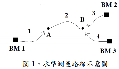 【已刪除】二、在圖 1 中,BM1~BM3 為已知水準點,其高程分別為 51.845 m、95.697 m 及 73.288 m, 假設無誤差;A、B 為待測點。1~4 代表水準路線編號,箭頭指示施測方向。路線 1~4 的觀測高程差及其標準差,依序為26.128 m ± 0.007 m、6.873 m ± 0.010 m 、 −10.852 m ± 0.008 m及11.552 m ± 0.006 m 。利用間接觀測平差,求 A、B 兩點的高 程及其標準差。(25 分) 圖 1、水準測量路線示意圖