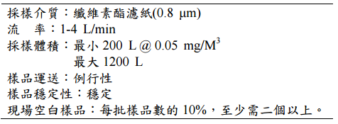 【已刪除】二、以下資料是擷取自「行政院勞工委員會採樣分析建議方法(3009 鉛)」。其中對採 樣介質、流率、採樣體積、現場空白樣品均有明確的說明、要求或建議適當範圍, 其意義為何?(15 分)