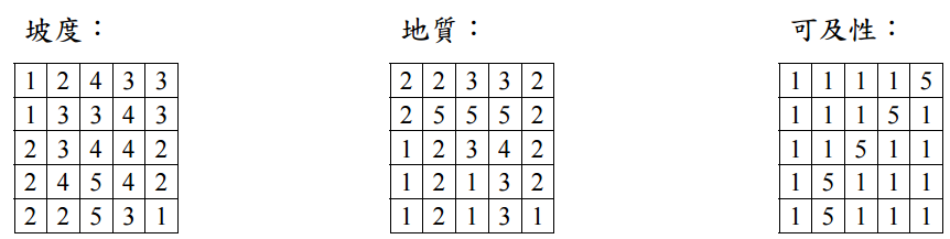 【已刪除】一、試簡述地圖代數(Map Algebra)原理,並就下列坡度、地質、可及性三項網格圖資, 分別以 0.6/0.3/0.1 之權重進行線性組合之疊圖計算,找出得分數最高的最佳開發區位。 (25 分)
