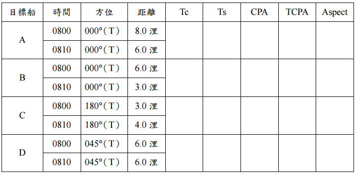 【已刪除】一、若本船航向(Oc) (T)、航速(Os)18 節,雷達觀測資料如下,試問各目標 000° 船之航向(Tc)、航速(Ts)、最近點距離(CPA)、最近點時間(TCPA)、相對 局勢(Aspect)。(20 分)