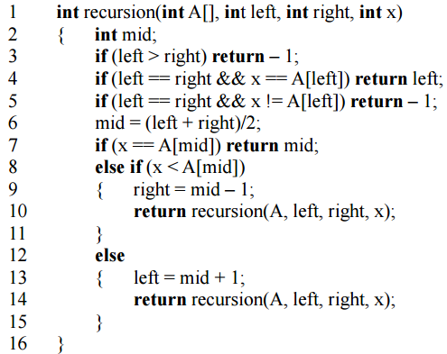 【已刪除】七、請閱讀下列 C 語言遞迴函式。其中 A 為 n 個元素的 C 語言整數一維陣列,left, right,x 以及 mid 皆為 C 語言整數變數。呼叫函式時 0 ≤ left,right < n。請注意 C 語 言的陣列索引從 0 開始起算。每列之前的數字是每列的編號,不屬於 C 語言程式。假 設呼叫函式時,陣列 A[]的元素已經依由小到大的順序排列,例如 A[] = {1, 2, 4, 9, 21, 30}。請說明下列 C 語言函式的功能,以及理由。(15 分)