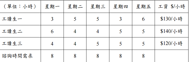 【已刪除】二、C 大學的資訊中心需工讀生回答學生的問題,共有 3 位工讀生,每位工讀生每小時 的工資、星期一至五可提供的諮詢時間(單位:小時)如下表。資訊中心每天需要 安排 8 小時的諮詢時間,每位工讀生每週至少 10 小時的工讀時間。在最小化每週 工資目標下,C 大學的資訊中心該如何安排每位工讀生每天的工讀時數?請定義決 策變數,並建立該決策問題的整數規劃模式。(不必求解)(10 分)