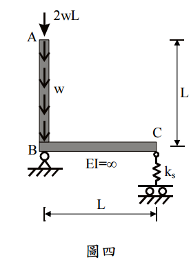 之線性彈簧。已知 A 點有一垂直力 2wL,AB 段有一施加在該段之均佈垂直力 w,試求此剛體挫屈時之 臨界載重 wcr。(25 分)