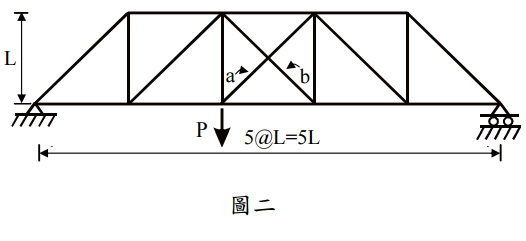 【已刪除】二、如圖二所示一桁架結構,已知其 a 桿及 b 桿僅能夠承受拉力、不能承受壓力,試求 此桁架結構受力後 a 桿及 b 桿之內力。(25 分)