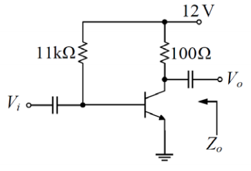 38.如圖(十八)所示電路,已知電晶體的β=60,熱電壓 VT=25mV,則其輸出阻抗 Zo 約為多少?