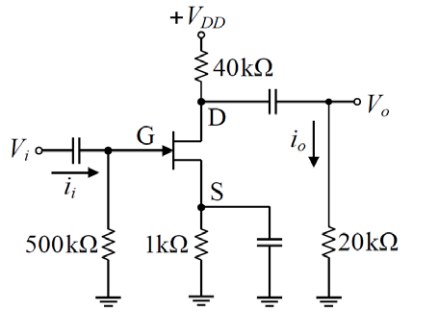 43.如圖(二十)所示之場效電晶體(JFET)共源極放大電路,若 JFET 之轉移電導 gm =2(mA/V),輸出電阻 rd=40kΩ,則放大電路的電流增益 Ai=(io/ii)為多少?