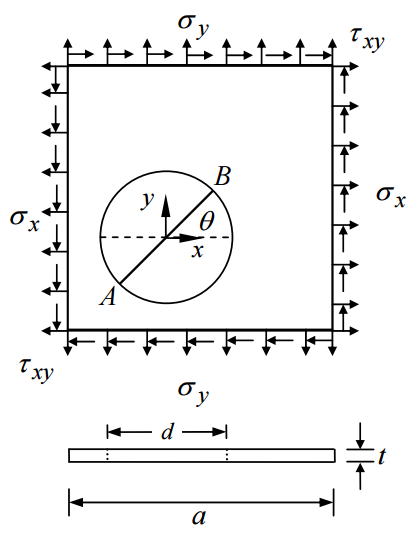 【已刪除】三、直徑為 d = 4 cm 之圓為如圖所示之等向均質彈性正方形薄板(Isotropic homogeneous elastic thin plate)的一部分,線段