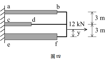 【已刪除】四、如圖四之結構,ab、cd 及 ef 都為軸力桿件,三桿件以剛性結構(繪黑色部分)連結, 已知 ab、cd 及 ef 桿件長度分別為 10 m、5 m 及 10 m 且各桿件之楊氏模數 E 與其斷 面積 A 之乘積如下:(EA)