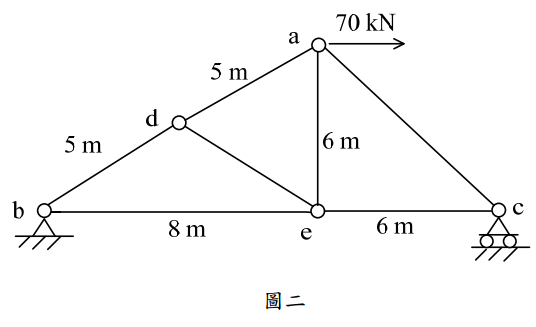 【已刪除】二、如圖二所示之桁架,各桿件都有相同之楊氏模數 E = 200 GPa、斷面積 A = 500 mm