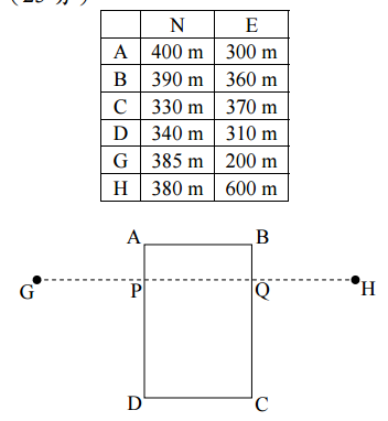 【已刪除】四、如下示意圖,A、B、C、D 為一宗地的四個界址點,G、H 為都市計畫街廓線的兩 個已知點,各點坐標如下。今街廓線與宗地界址線的分割點為 P、Q,試求出 P、Q 兩點的 N、E 坐標。(25 分)