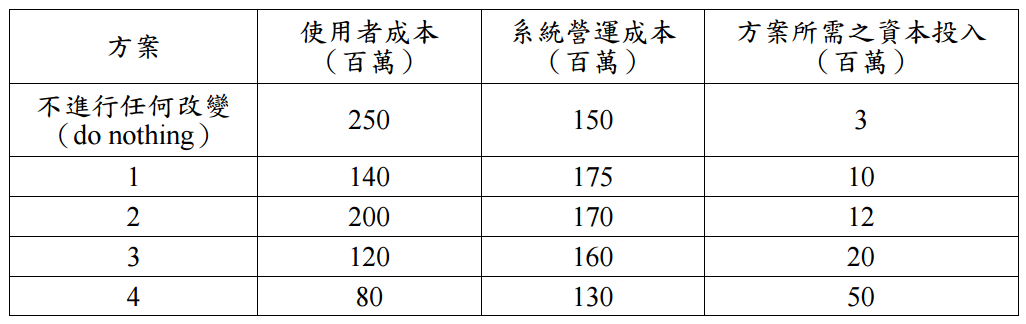 【已刪除】四、政府在規劃一個交通系統的建設,有下列數個方案可以選擇,請問那個方案是最具 有經濟效益,請列出所有分析的步驟?(25 分)