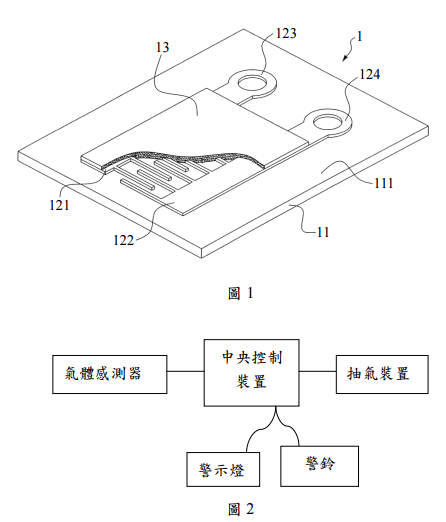 2 與 ZnO 混合物形成的氣體感測薄膜之方式可利用各種沉積方法,如電 漿輔助沉積法、燒結法、化學氣相沉積法或物理氣相沉積法。 另外,本提案感測器上的基板材質可為陶瓷基板,例如氧化鋁,電極可為金、白金或 其合金,而電極的形狀也可為各種形狀,例如直條狀電極或梳型電極。此外,係可利用網 版印刷的方式形成電極。 為了增加其靈敏度本發明的氣體感測薄膜表面可利用上述的沉積方式一奈米碳管。 本提案同時結合一種警報系統,其可偵測 CO 及 NO 的濃度。測量的方法為量測氣體 感測器的兩電極之間的電阻值變化所產生的訊號,將此訊號與ㄧ預設值比較。該預設值係 與氣體的濃度有正相關。當偵測到 NO 時與偵測到 CO 時所發出的警鈴聲與所顯示的警示 燈會有所不同,並在中央控制裝置中以文字顯示出所偵測到的氣體。 本提案的警報系統如圖 2 所示。當氣體的濃度高到超過預設值時,此時,發出警鈴聲 與警示燈,並且將訊號傳遞至抽氣裝置中,並同時啟動氣體抽除,直至氣體抽除至低於預 設值為止。