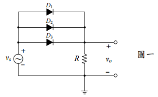 為一正弦波輸入, 請將輸入及輸出電壓隨時間變化的波形關係,同時畫在一電壓-時間( v − t )的座 標圖上,同時說明兩組波形不同的原因及其電壓峰值之差異值。(12 分)